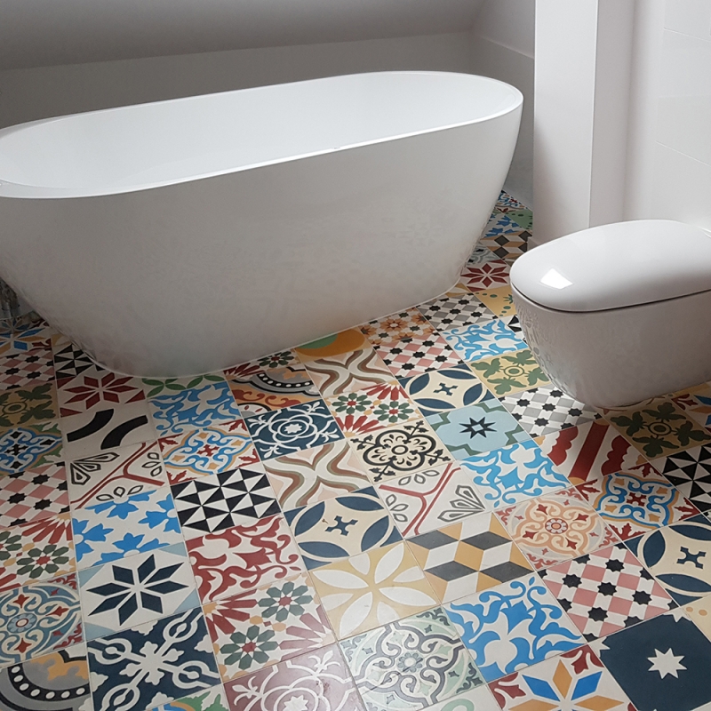 Cementowe płytki Patchwork łazienka pełna koloru
