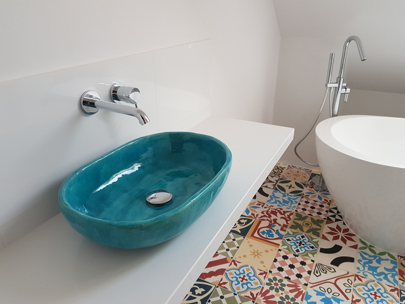 Turkusowa rzemieślnicza umywalki i płytki cementowe Patchwork na podłodze w łazience
