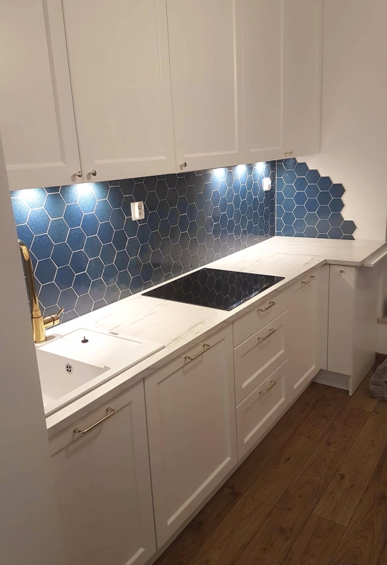 Niebieskie płytki sześciokątne ściana kuchnia
