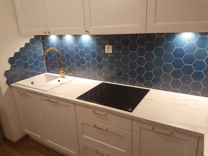 Niebieskie płytki sześciokątne na ścianie w kuchni