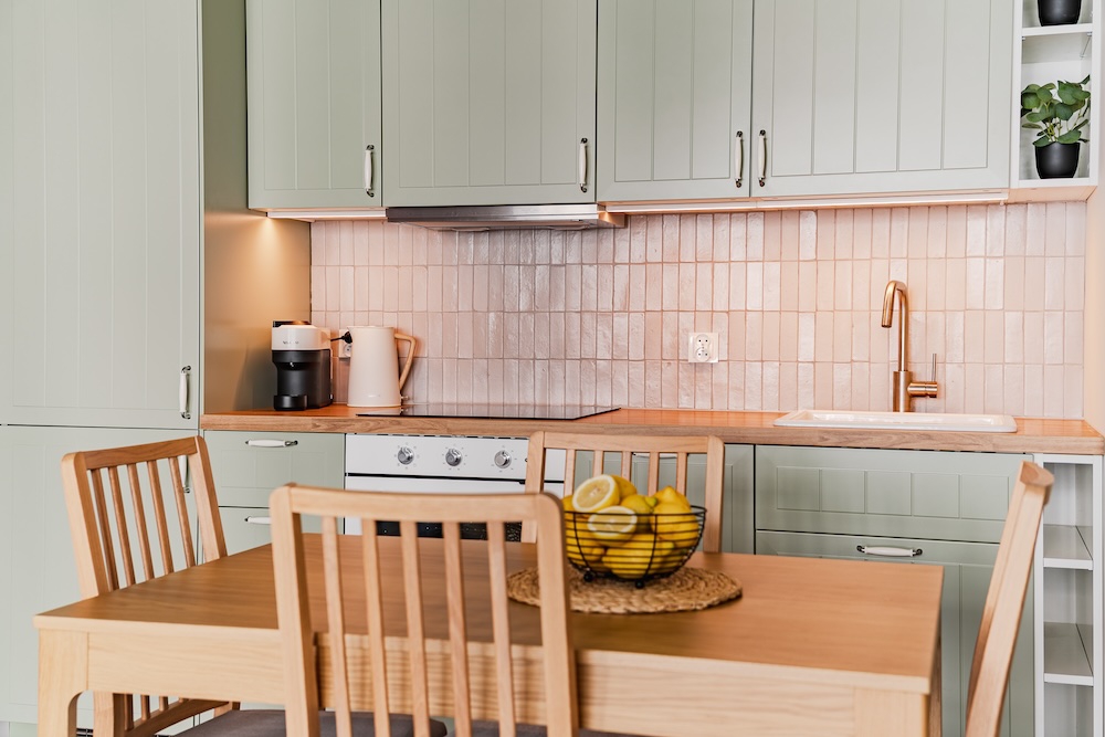Azulejo Beige Matt Fliesen im Format 5x15 cm haben ihren Platz an der Küchenrückwand gefunden. Bitte beachten Sie, dass der auf den Fotos sichtbare rosige Farbton durch die Beleuchtung entsteht. Bilder, die die tatsächliche Farbe der Fliesen zeigen, finden Sie in der Produktgalerie.