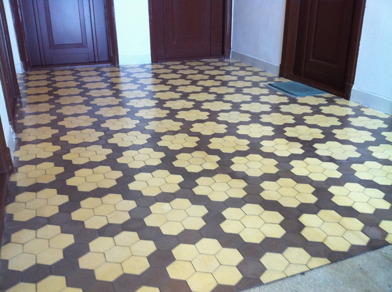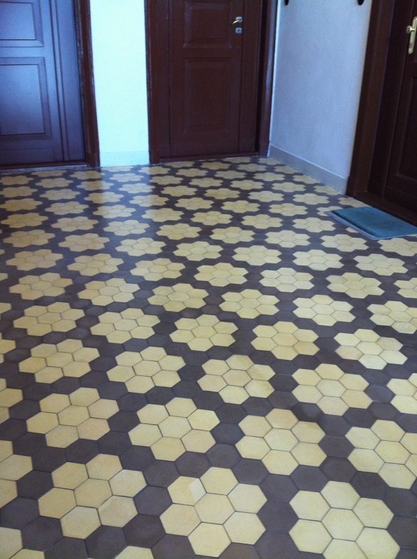 Płytki sześciokątne w kamienicy Filtrowa 68
