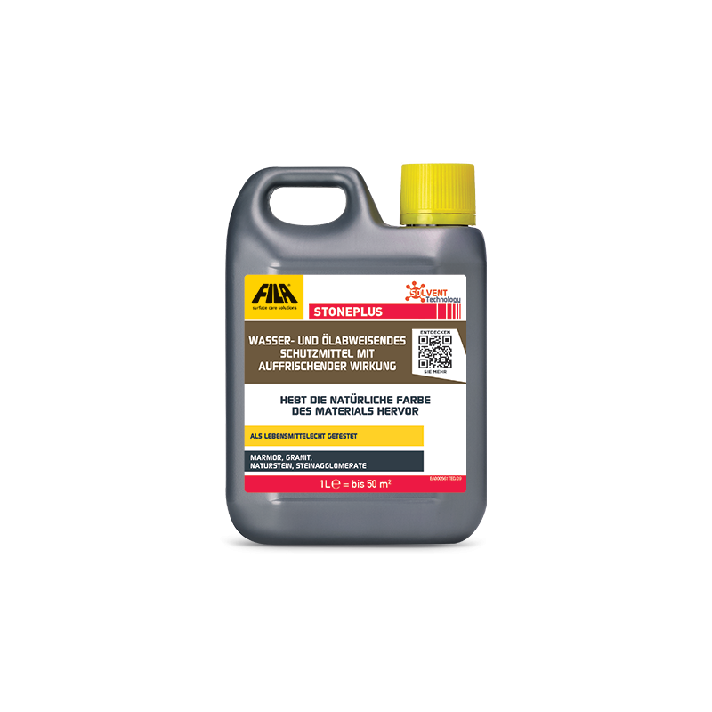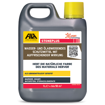 FILA STONEPLUS ist ein professionelles Schutzmittel, das Naturstein, Terracotta, Cotto und Agglomeraten einen dauerhaften Fleckenschutz bietet und gleichzeitig die natürliche Farbigkeit intensiviert. Es hebt Maserungen und Strukturen hervor und verleiht den Oberflächen eine edle, samtige Tiefe. Dank seiner lösungsmittelbasierten Formel dringt STONEPLUS tief in die Poren ein, ohne einen Film zu bilden. Es verstärkt die natürliche Schönheit des Materials durch einen eleganten, langanhaltenden „Wet Look“ und schützt zugleich zuverlässig vor Wasser, Öl, Fett und Alltagsflecken. Ideal geeignet sowohl im Innen- als auch im Außenbereich, für Böden, Wandverkleidungen, Arbeitsplatten und andere Oberflächen aus saugfähigem Naturstein.
